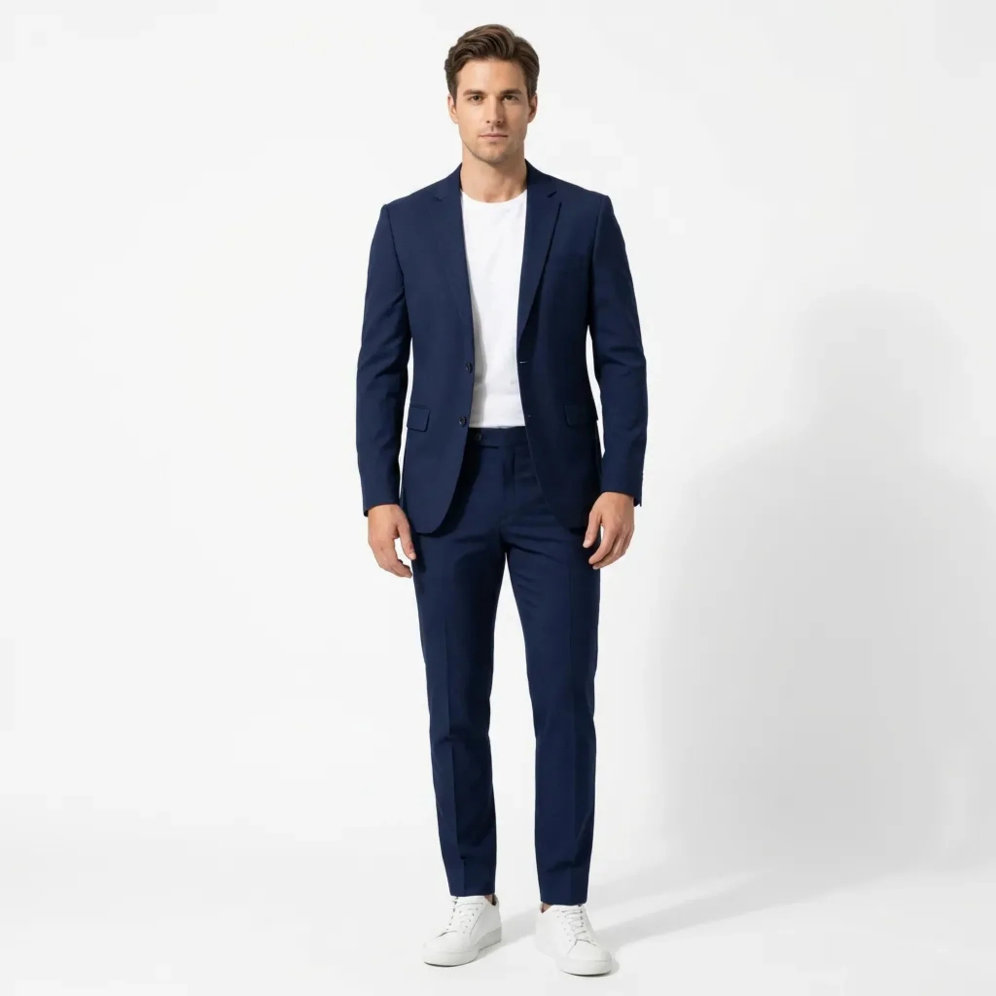 This men’s two piece suit set includes a tailored jacket and matching trousers designed for formal and smart occasions. The jacket features a classic lapel collar, front button closure, and structured silhouette, while the trousers offer a straight-leg design with a standard waistband. The men’s formal suit set presents a solid colour woven fabric suitable for gatherings, events, and everyday professional wear.