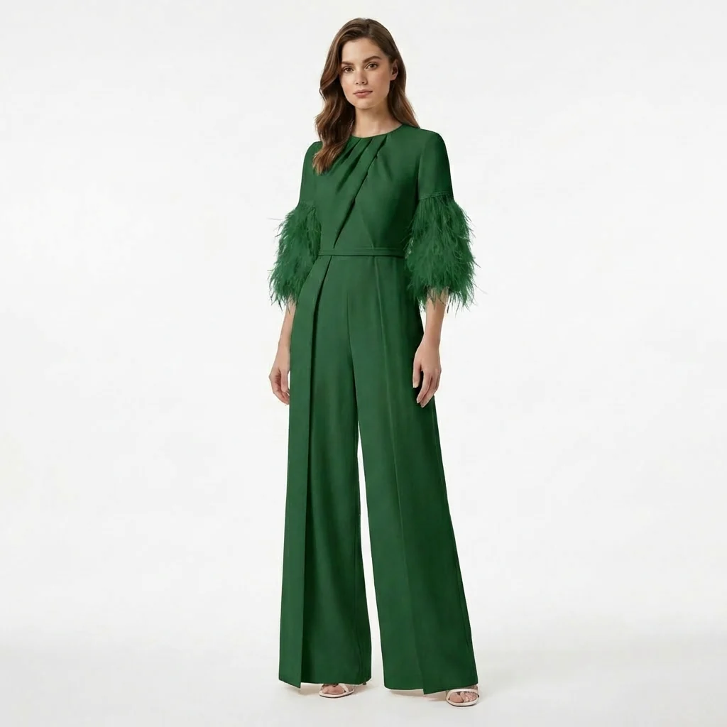 This jewel neck jumpsuit features a structured silhouette with a straight leg jumpsuit design. It includes half sleeves with feather trim, a defined waist seam, and full-length straight-leg trousers.
