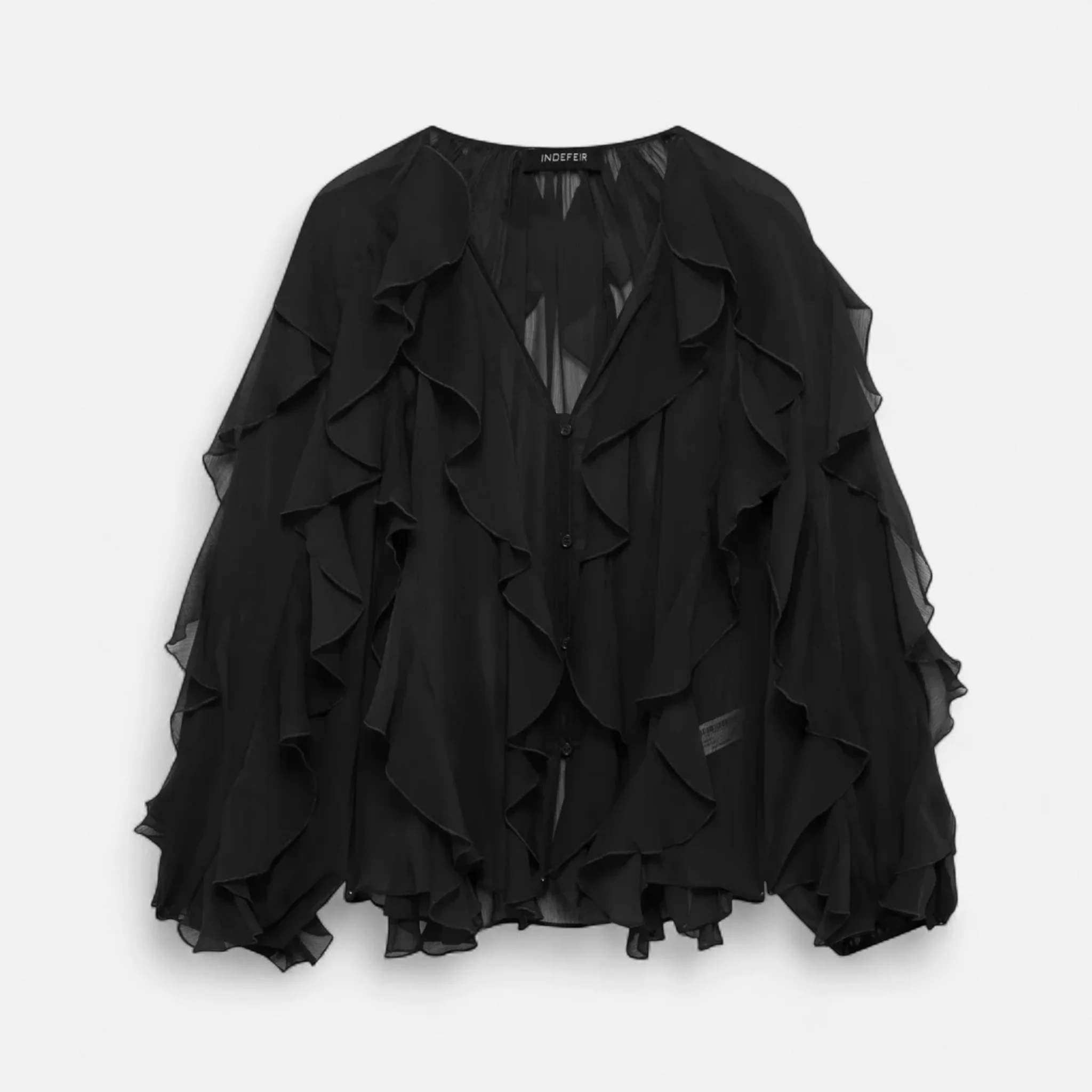 Elevate your wardrobe with Aveline the Label’s translucent ruffles blouse. Your look becomes effortlessly graceful, combining delicate sophistication with timeless refinement. The soft, flowing fabric and ruffled details create an elegant silhouette that moves beautifully with every step.