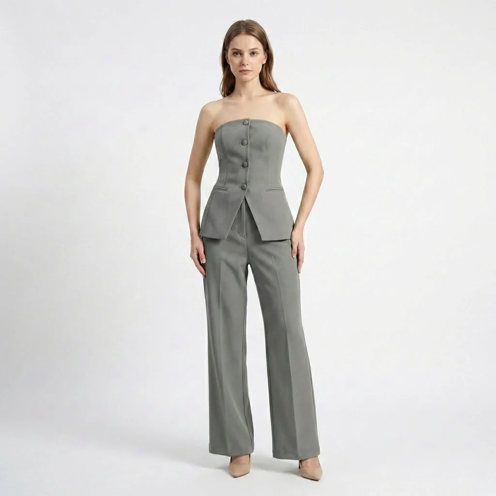 Women’s Strapless Two Piece Set – Button Front Wide Leg