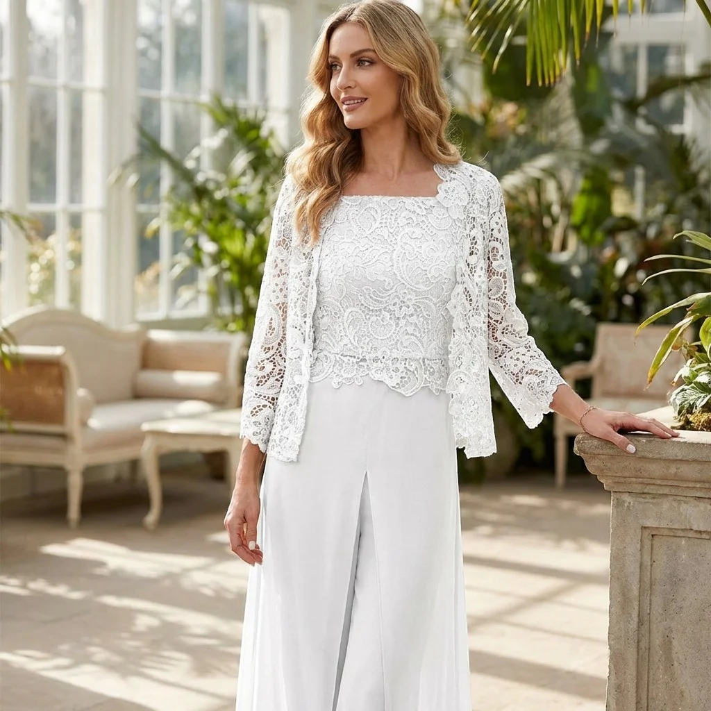 This pantsuit set features a coordinated silhouette with a three piece pantsuit set design. It includes a square-neck sleeveless top, wide-leg trousers with split hem detail, and a lace overlay jacket.