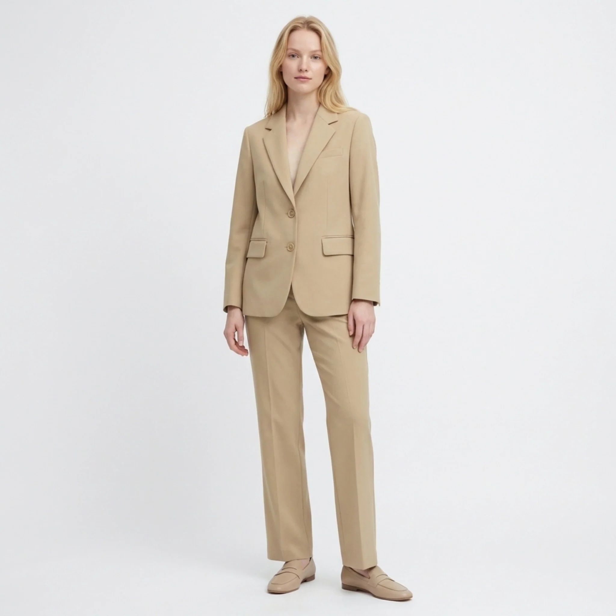 This tailored two piece set features a structured blazer with a notched lapel and single button front closure. The women’s blazer trouser set includes straight leg trousers with a mid-rise waist and clean seam detailing, forming a coordinated outfit suitable for formal settings.