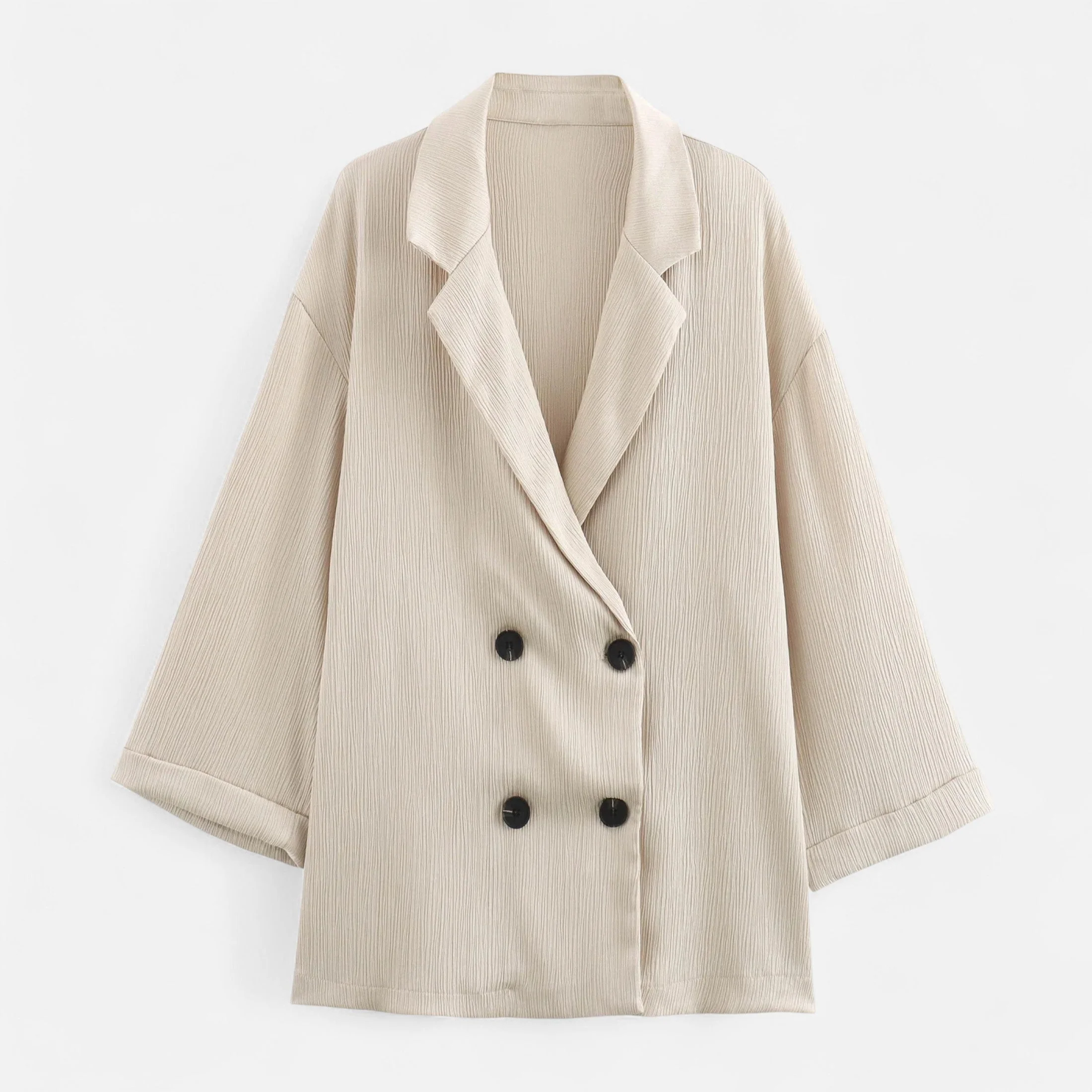 Designed for transitional days, the double-breasted jacket with its turn-down collar brings timeless structure, while the mid-waisted trousers flow with relaxed confidence. Together, they form a statement ensemble — polished yet unrestrained, perfect for both business casual settings and refined weekend style.